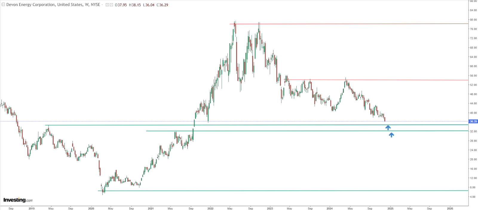 2. Devon Energy : Approche d’un support clé dans une tendance baissière