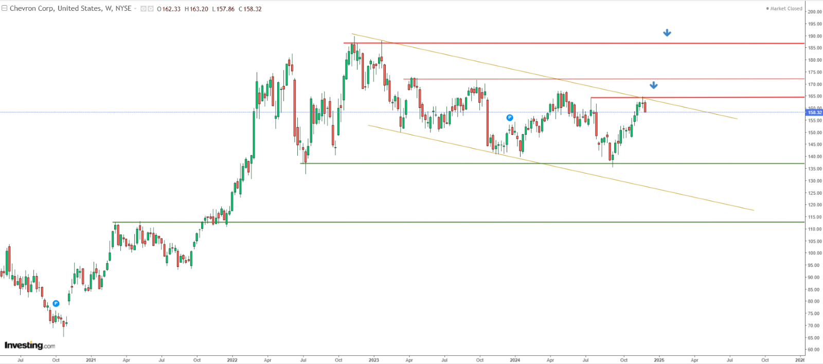 Après les récentes hausses de prix, l’action Chevron teste la résistance au niveau de 164 dollars par action. Un dépassement de ce niveau pourrait indiquer un retour à la croissance.