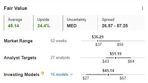 Un rebond pourrait s’aligner sur l’indication de juste valeur d’InvestingPro, qui suggère un potentiel de hausse de 24 %. Cependant, un effondrement en dessous de 35 dollars pourrait faire baisser le cours de l’action, qui pourrait alors atteindre la barre des 30 dollars par action.