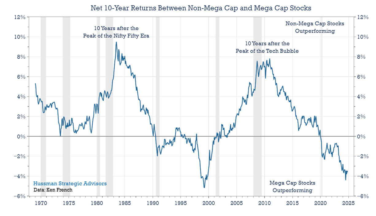5. The Mega Cap Pendulum Swings: Meanwhile another parallel with the dot com peak is the rolling 10-year performance spread between non-mega vs mega cap stocks. Currently mega cap stocks’ relative performance is a stretched levels. And there sure seems to be a cycle there.