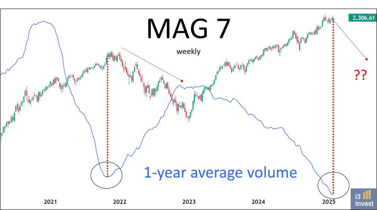 1. Mag-7 Volume Warning: Starting off with an intriguing eye-catcher, this chart shows the 1-year rolling average trading volume in Mag 7 Stocks. The concern is it seems to be doing a similar thing to what it did late-2021 into the pandemic stimulus frenzy peak. Taken by itself you might dismiss it, but there are a few other points to ponder on this…