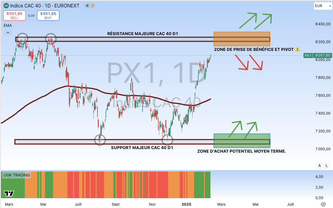 Si le CAC 40 parvient à franchir la barrière des 8 280 points, il n’y aura plus de résistance technique majeure, ouvrant la voie à une poursuite de la tendance haussière. Cela pourrait aligner l’indice parisien avec la dynamique plus propre et directionnelle observée sur les indices américains (S&P 500, Nasdaq) ou même sur le DAX en Europe.