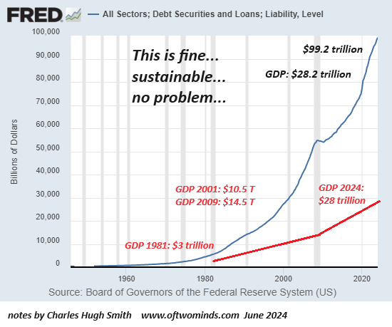 This describes the current global system: conditions have changed but these structural changes are not visible. On the surface, the present looks like the recent past. Yes, technology changes, but this constant churn of new technology has long been part of the system.