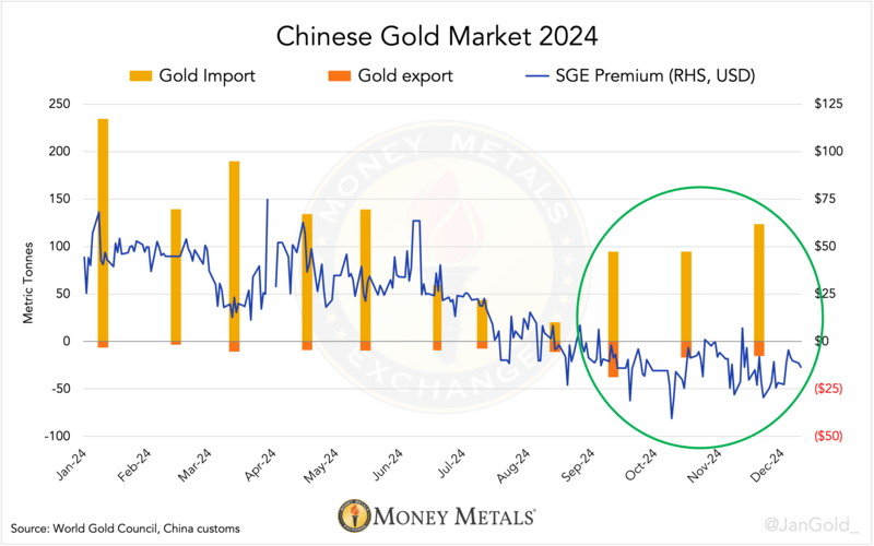 In November, gold on the SGE was still trading at a discount, yet Chinese gross gold imports swelled to 122 tonnes. No doubt the PBoC struck big in the London Bullion Market once again.