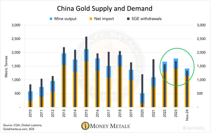 Chart 1. From 2022 until November 2024 there is a surplus in the Chinese gold market, because import and domestically mined gold was more than SGE withdrawals.