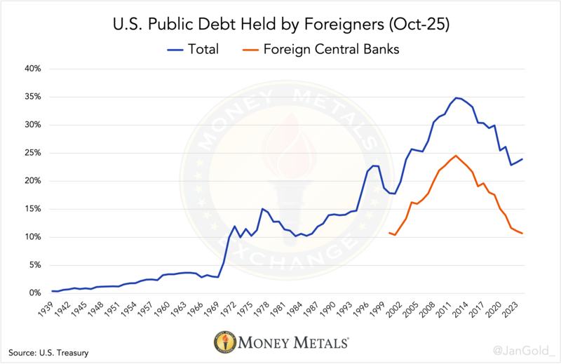 As a result, less and less of the U.S. its excessive public debt (122% of GDP) is financed by foreigners, let alone foreign central banks. This forces Treasury to either reduce the fiscal deficit (currently 6% of GDP, good luck!), pay higher interest rates and accelerate the debt spiral, or print its way out of this through inflation.
