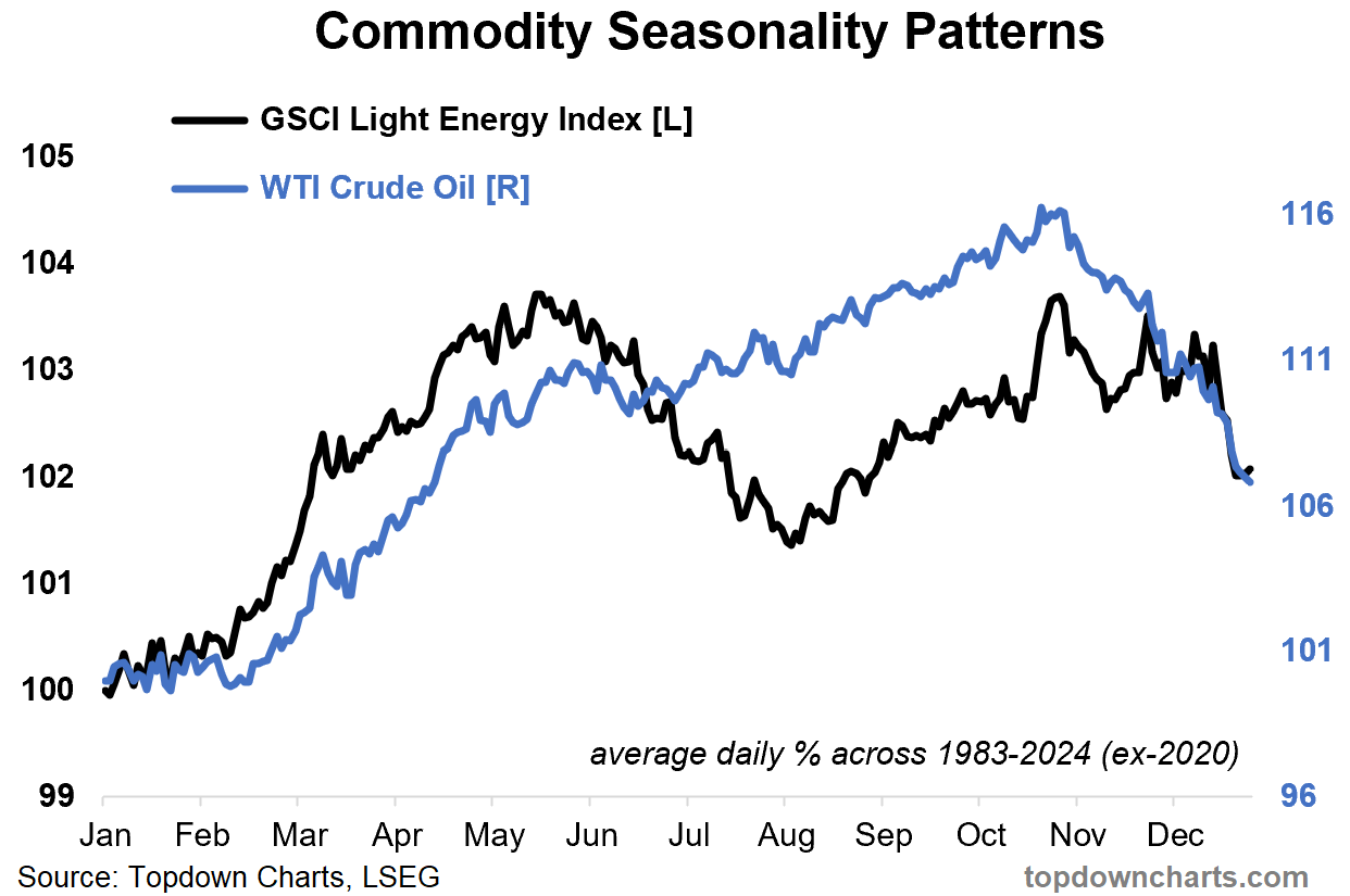 First, straight into the chart: it shows the historical seasonal pattern of commodity prices (diversified GSCI Light-energy index) and WTI crude oil.