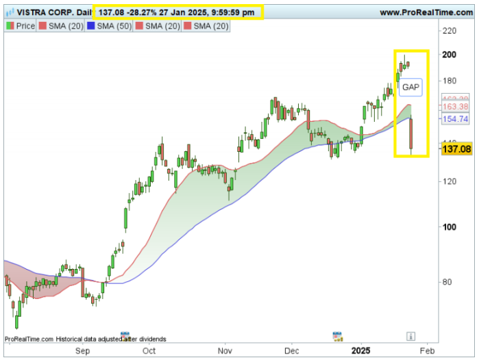 Par effet ricochet, nous avons également constaté d’importants sell off dans le nucléaire ou plus largement au sein des producteurs d’énergies, comme avec Vistra qui a trébuché de près de 30 % sur la seule séance d’hier (cf. encadré en jaune ci-dessous).
