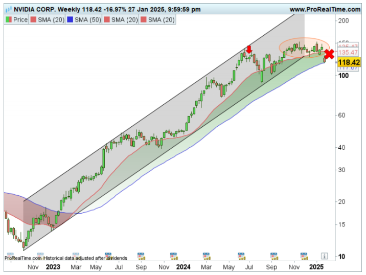 Depuis cet évènement, le cours de Nvidia a amorcé une phase de baisse, avec désormais un risque de sortie par le bas dudit canal.