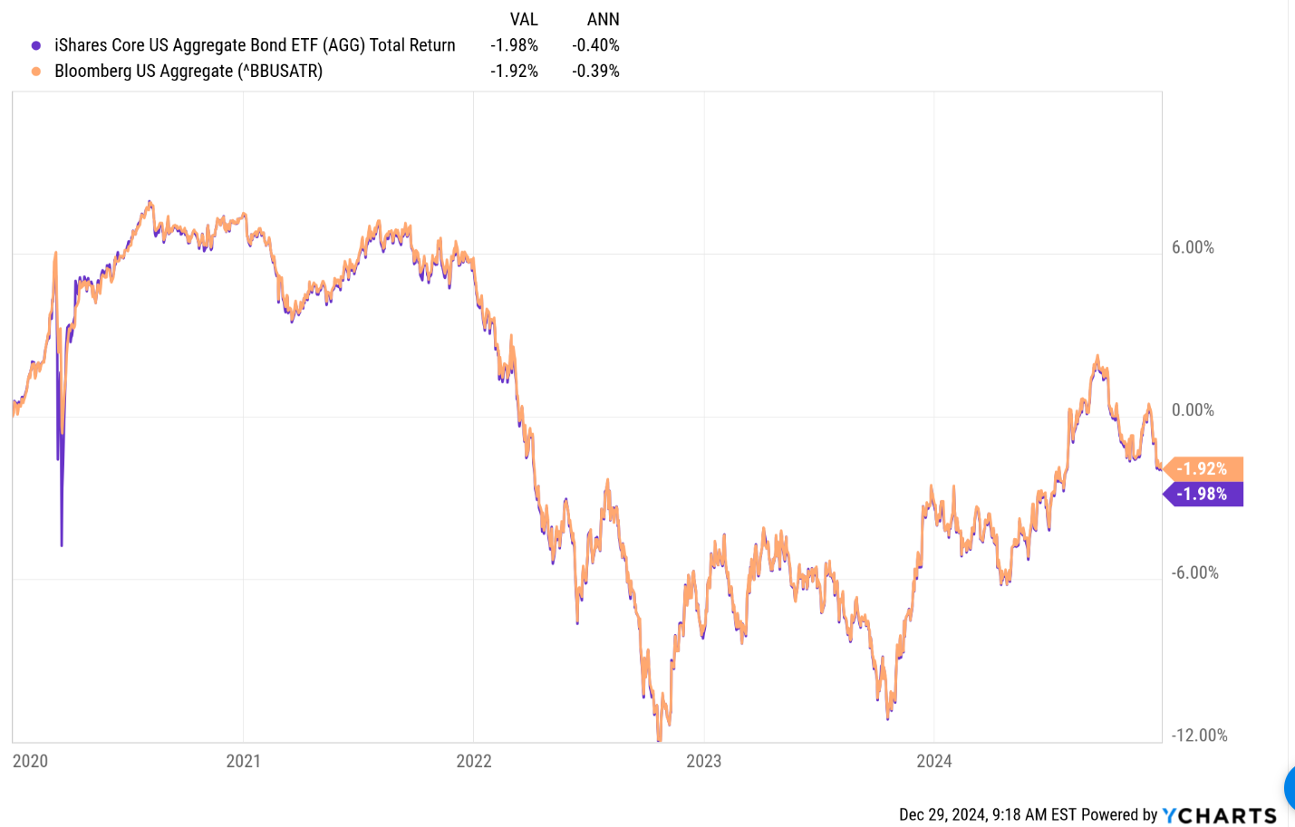 This a grim chart for the AGG decade-to-date, as it shows a negative total return from 1/1/2020 to 12/27/2024.