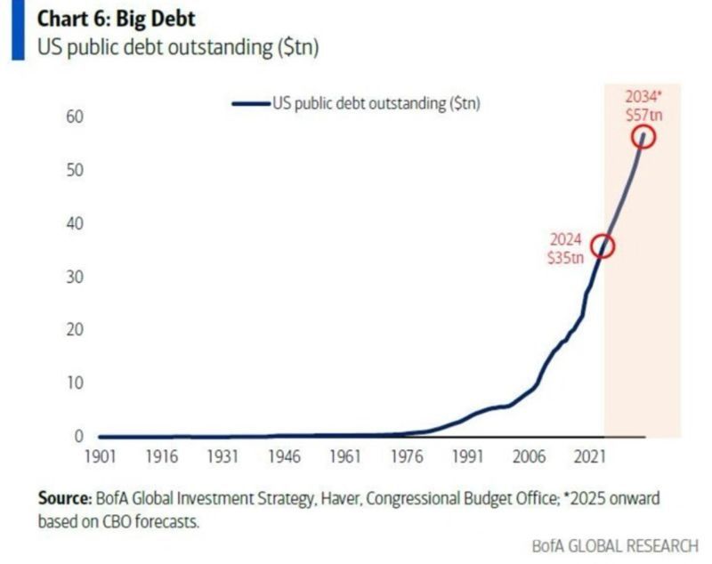 Según Bank of America (NYSE:BAC) (BofA), la deuda nacional de EEUU alcanzará la ENORME cifra de 57 billones (trillions) de dólares durante la próxima década, según las últimas previsiones de la CBO (Congressional Budget Office: la “propia” Oficina de Presupuesto del Congreso de EEUU).