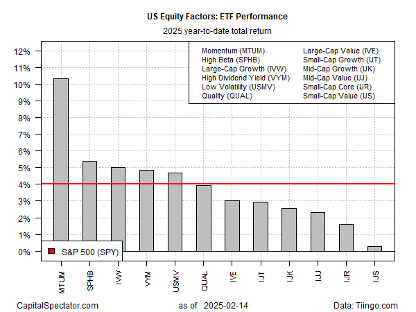 Le facteur dynamique écrase la concurrence depuis le début de l’année, sur la base d’un ensemble d’indices ETF jusqu’à la clôture de vendredi (14 février). Après avoir connu une forte progression l’année dernière, le facteur momentum s’est envolé en 2025 en termes relatifs et absolus.
