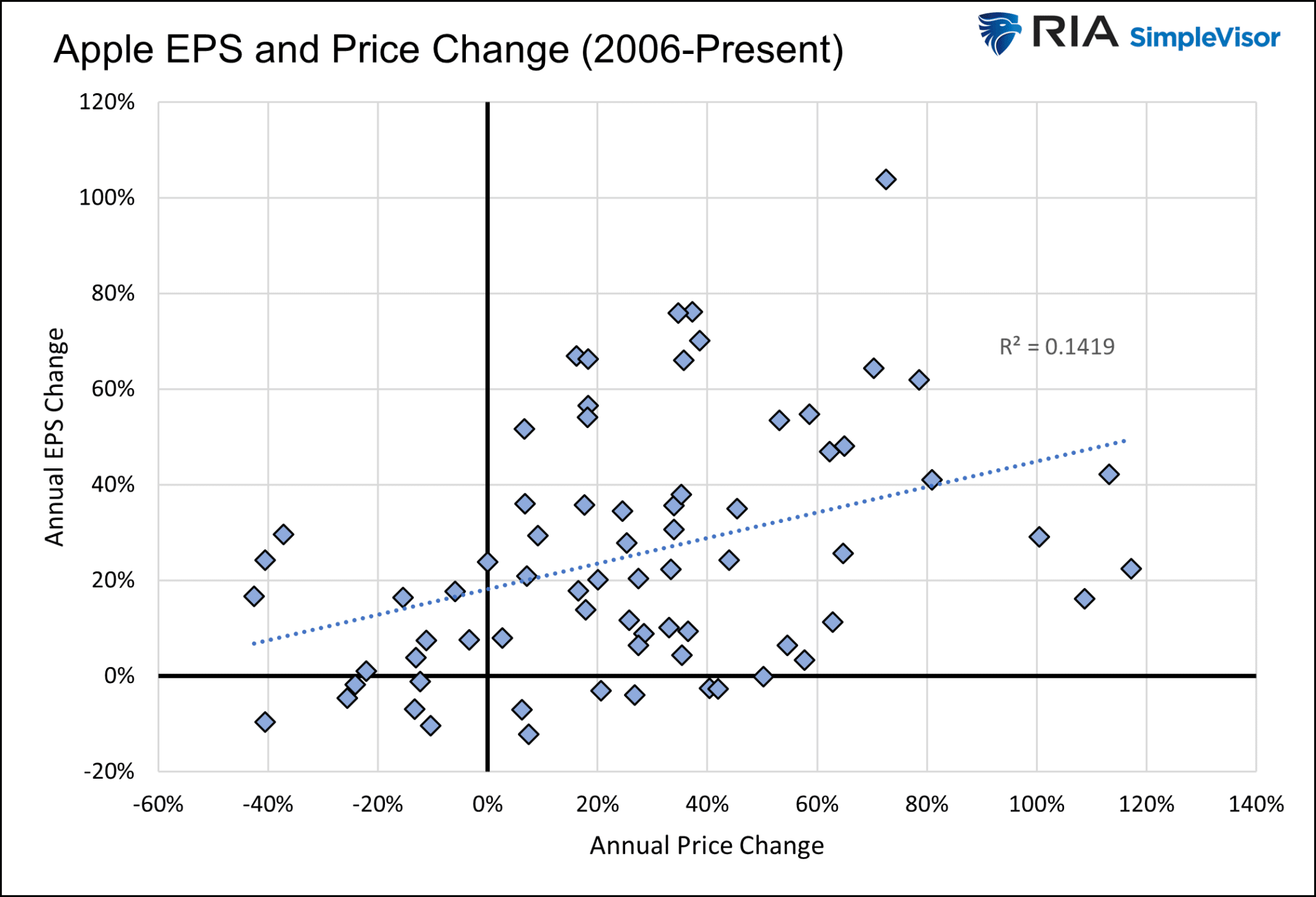 Aunque predijese perfectamente los beneficios de una empresa, no hay garantía de que las acciones vayan a comportarse como usted pensaba. Por ejemplo, el gráfico de dispersión muestra las variaciones de un año del precio de Apple (NASDAQ:AAPL) frente a la variación de un año de los beneficios. La R-cuadrada de 0.149 denota una escasa correlación entre beneficios y precio a corto plazo. Si se amplía el análisis a periodos de cinco años, la R cuadrada aumenta a 0.37, pero la relación sigue sin ser estadísticamente significativa.