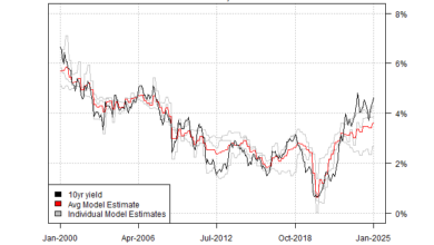 El gráfico de dispersión mensual a continuación muestra que desde 1990, los rendimientos a diez años y el Índice de Expectativas de Inflación de la Fed de Cleveland, que también es de diez años, tienen una R-cuadrada de .966. Sencillamente, el 97% de los rendimientos de los bonos del Tesoro pueden explicarse por el Índice. Como puede ver, el rendimiento actual (verde) se sitúa aproximadamente un 1% por encima de la línea de tendencia. Por lo tanto, los rendimientos actuales están aproximadamente un 1% por encima del valor razonable.