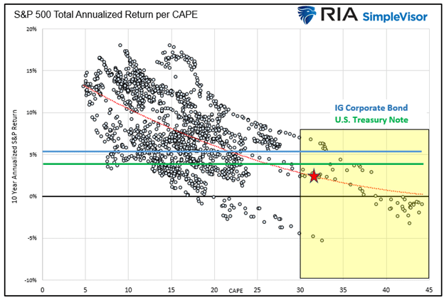 Cada punto de abajo muestra cada instancia mensual de CAPE 10 valoraciones de las acciones y el siguiente rendimiento de las acciones de diez años, incluidos los dividendos, desde 1881.