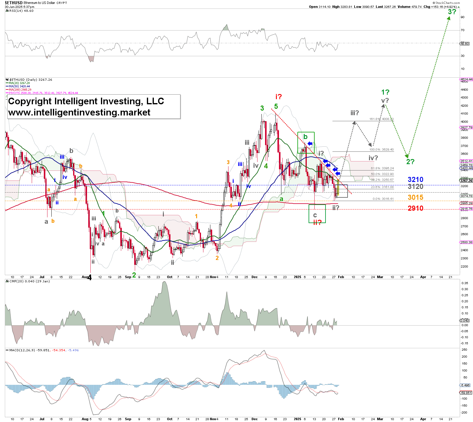 В краткосрочной перспективе, при условии удержания выше $3015 и особенно минимума 13 января на $2910, мы ожидаем, что Ethereum достигнет в идеале $4400+/-200, прежде чем последует более значительный откат к ~$3600+/-100 или $3200+/-100. Мы ожидаем, что ETHUSD дойдет примерно до $8900 с любого из этих уровней, прежде чем начнется следующий значительный откат (примерно на 3000 пунктов).