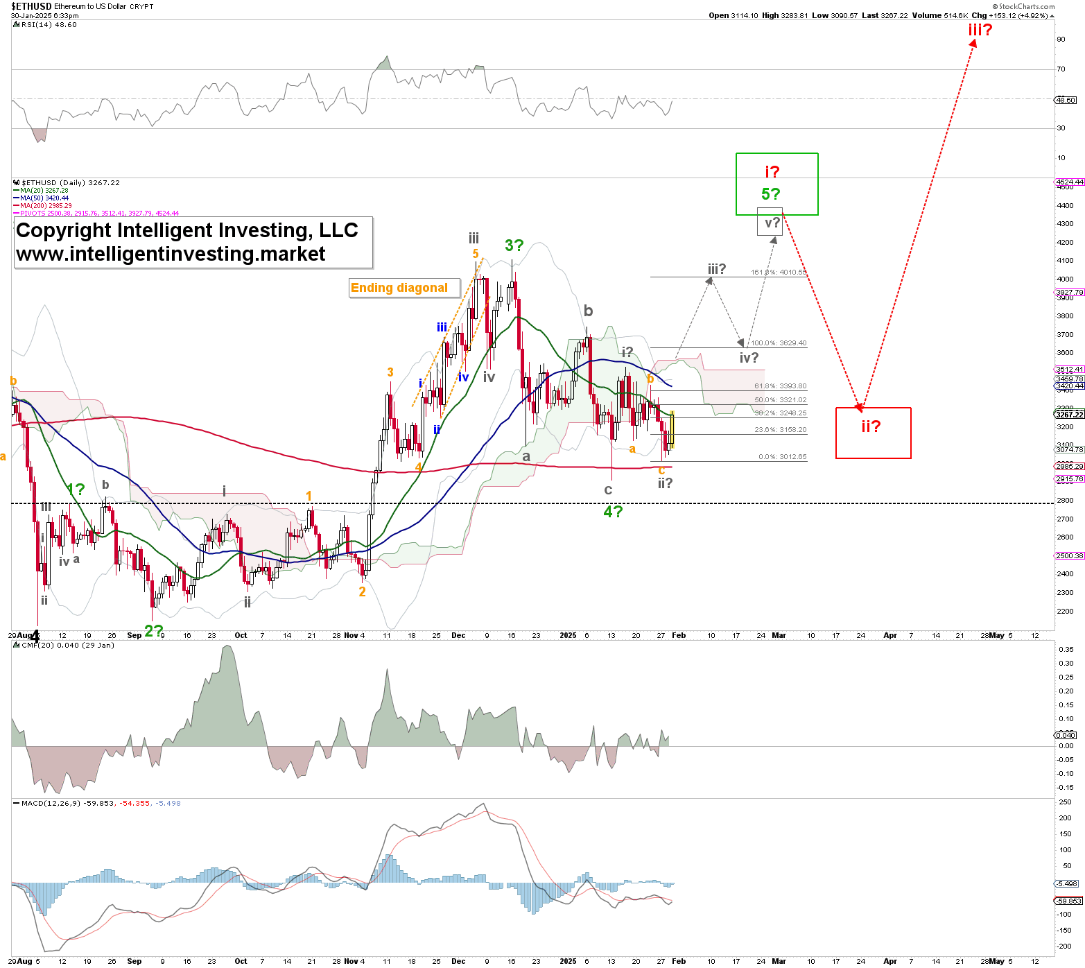 Используя волновой принцип Эллиотта, мы обнаружили, что Ethereum (ETHUSD), вторая по величине криптовалюта по рыночной капитализации, скорее всего, завершила пять (зеленых) волн вверх от минимума августа 2024 года и три волны вниз к минимуму 13 января. См. график 1 ниже.