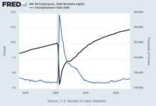 - Finally, the 4-week moving average of initial unemployment claims rose to 224K from 217K last month, hitting the highest level of the year so far early in 2025.