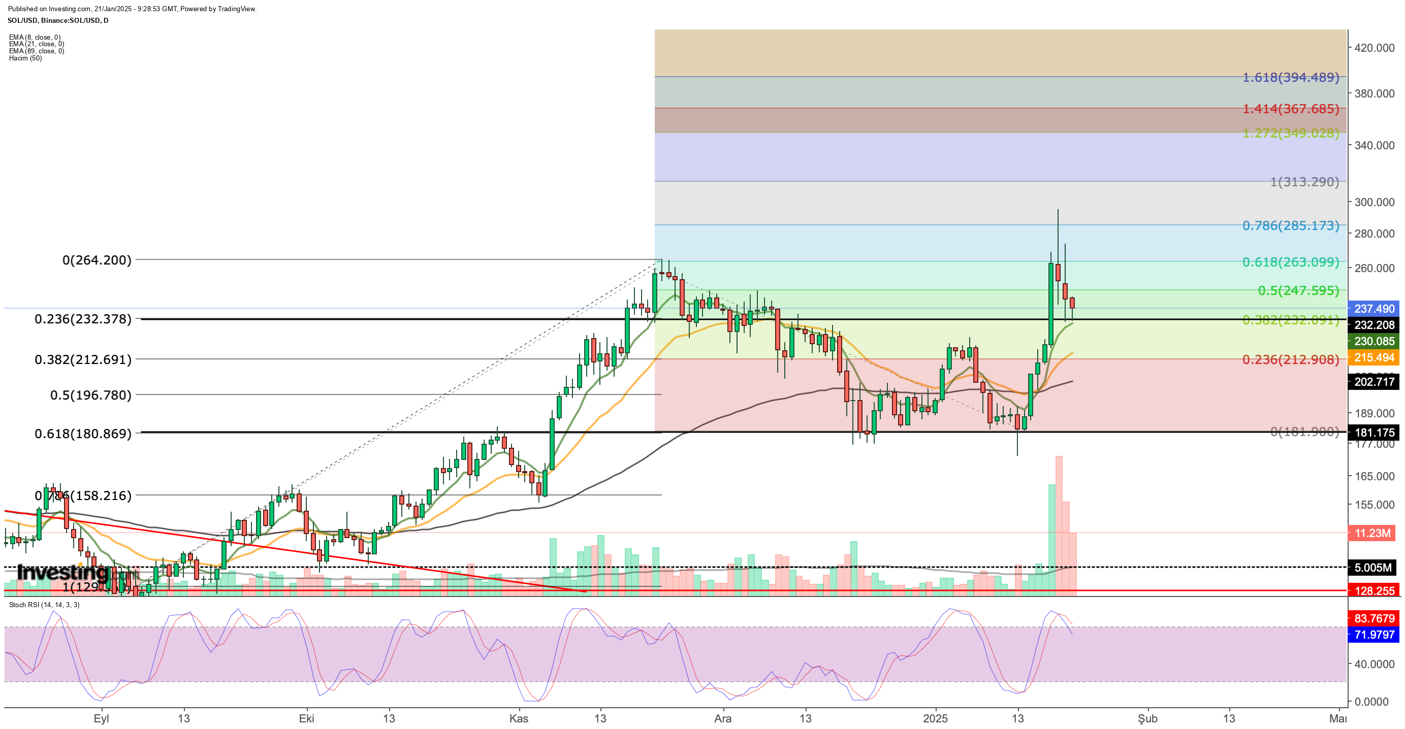 После коррекции до $180 курс Solana резко вырос, недавно достигнув отметки $294, а затем отступил и протестировал уровень поддержки $232. Удержание выше этого уровня будет иметь решающее значение для продолжения восходящего тренда SOL. Прорыв выше $265 может открыть дверь для ралли в направлении $350-400 в среднесрочной перспективе, с промежуточными сопротивлениями на $285 и $315.