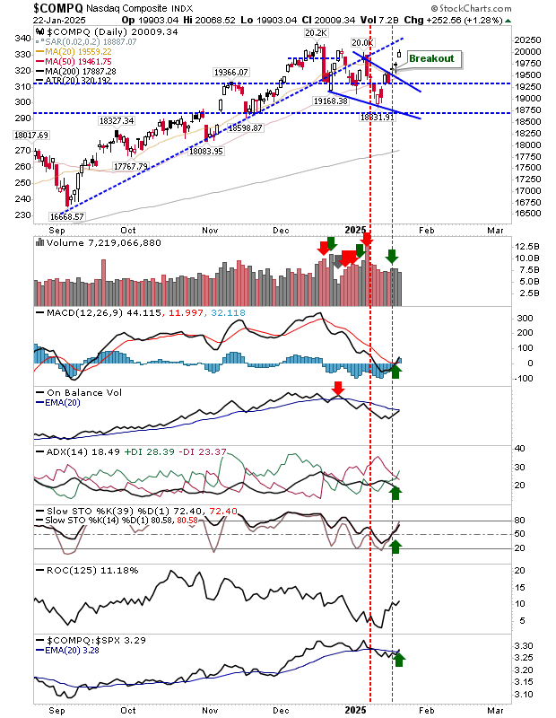 The Nasdaq did a little better for peer indices and cleared the psychological 20K mark for a third time. This came with a MACD trigger ‘buy’ along with a ‘buy’ in ADX.
