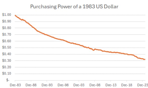 De même, si le cadre nominal est le cadre par défaut pour les comparaisons à court terme, il n’est manifestement pas le plus important pour un consommateur. Une personne qui négocie un salaire pour un nouvel emploi et qui sait qu’elle gagnait 40 000 dollars par an en 2004 serait mal avisée d’utiliser ce chiffre comme point de départ. Le cadre qui compte dans le temps est le cadre réel, ou corrigé de l’inflation. Dans le graphique ci-dessus, si l’on représentait le pouvoir d’achat d’un dollar de 1983 corrigé de l’inflation, on obtiendrait une ligne plate à 1 dollar[7]. En revanche, si l’on représentait la valeur de ce même dollar de 1983 corrigé de l’inflation, on obtiendrait une augmentation presque constante de 1 dollar à 3,15 dollars au cours de la même période.