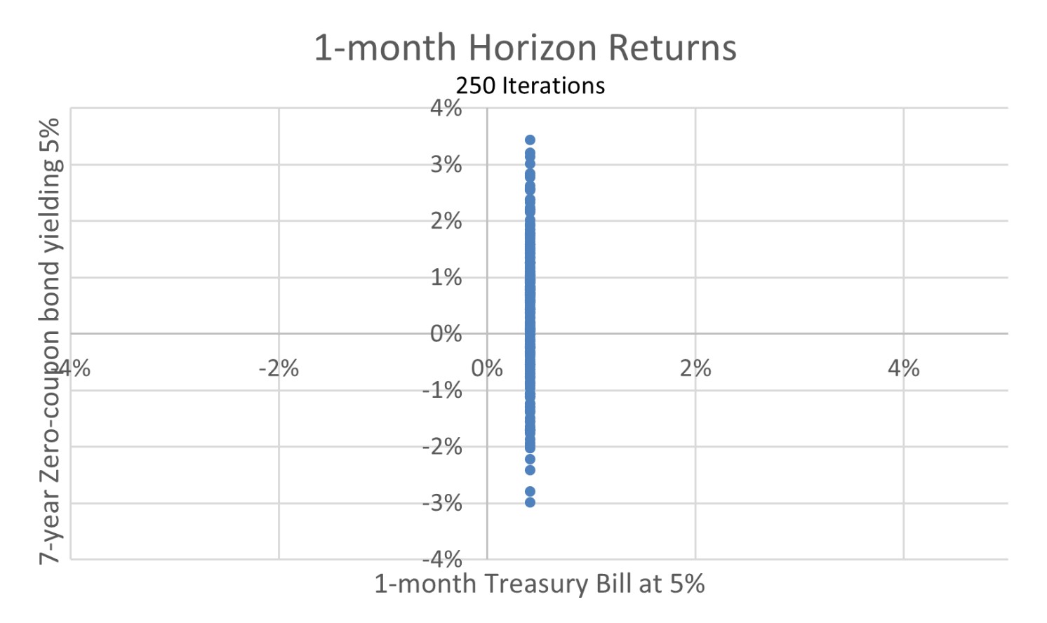 Le rendement attendu est approximativement le même pour les deux stratégies ; parfois la stratégie de roulement des bons du Trésor finit par l’emporter et parfois la stratégie d’achat et de conservation l’emporte. Avec des rendements attendus similaires, un investisseur rationnel choisirait donc celle qui présente le risque le plus faible. Mais le caractère risqué ou stable des rendements dépend fortement de l’horizon temporel de l’observateur. Chacun des trois graphiques suivants est tiré des mêmes 250 itérations de Monte Carlo, mais le rendement cumulé est échantillonné à un horizon différent. Dans la figure 4, les rendements cumulés sont échantillonnés à l’horizon d’un mois. Dans la figure 5, l’échantillonnage se fait à l’horizon de 3 ans. Dans la figure 6, l’échantillonnage se fait à l’horizon de 7 ans. Pour chaque figure, le rendement cumulé de la stratégie des bons du Trésor est indiqué sur l’axe des abscisses et le rendement cumulé de la stratégie d’achat et de conservation des obligations à coupon zéro est indiqué sur l’axe des ordonnées.