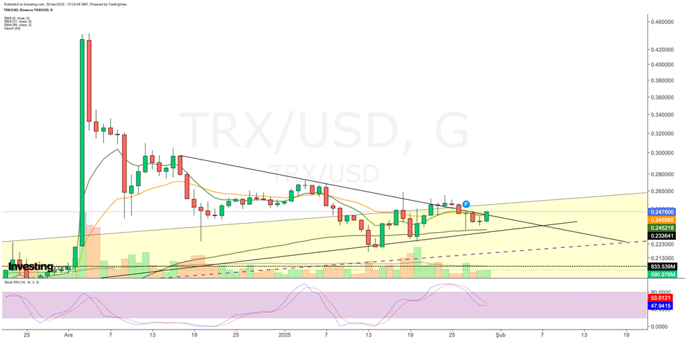 If the price stays below $0.25, we’re likely to see continued sideways action with a bearish tilt. The first support remains at $0.23, and a breakdown could pull the price to $0.21, aligning with the mid-line of the rising channel. Short-term indicators, like the Stochastic RSI, suggest the downtrend could persist. However, if buying volume picks up at $0.23, a new bullish trend could emerge. On the flip side, a drop below $0.20 would raise the risk of further downside for TRX.