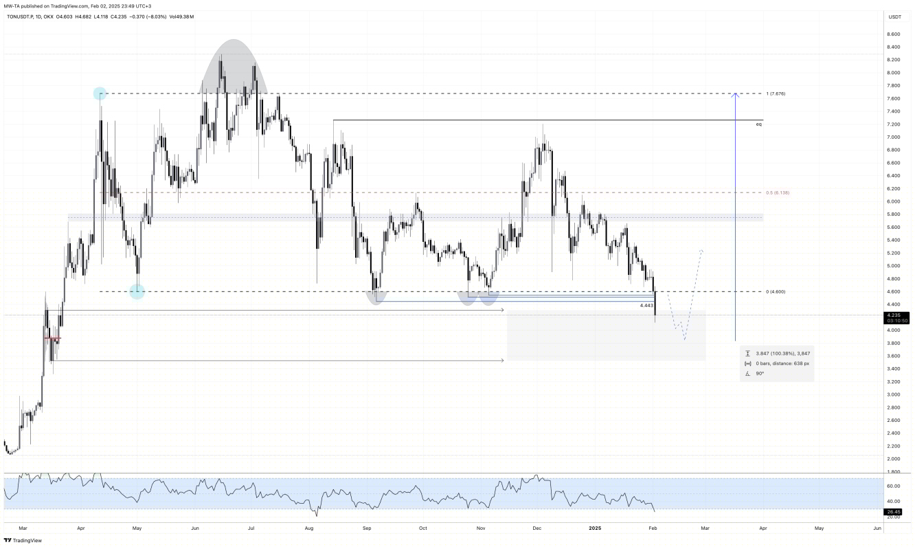 В этой зоне мне будет интересно докупить TON на спот. От этой проторговки с объёмами путь-дорога смело может привести к верхней границе боковика, а это +100% движения цены, и, по сути, выйдут довольно несложные х2 к вложенной марже.