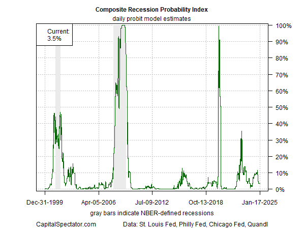 As reported in this week’s issue of The US Business Cycle Risk Report (a sister publication of CaptialSpectator.com), the probability that an NBER-defined downturn has started or is imminent is currently below 5%.