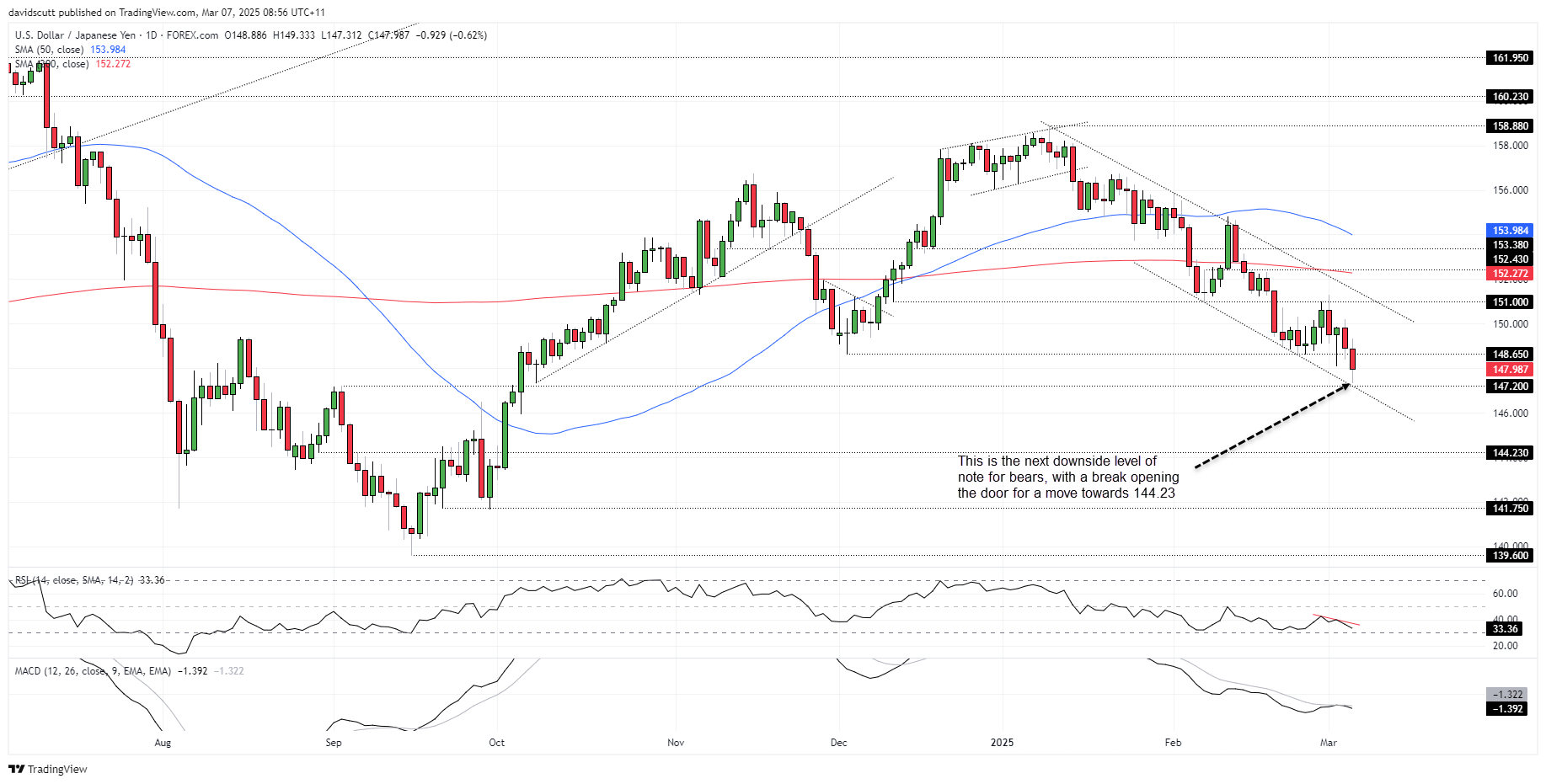 A break of 147.20 would put 144.23 in focus, given the significance of this level in September and October last year. On the topside, 148.65 may now act as resistance, with 151 a more substantial barrier beyond that.