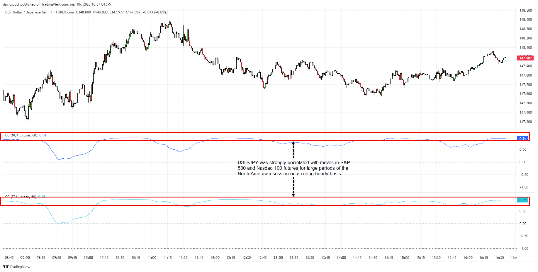 As the yen rallied, U.S. stock futures tumbled, with the one-minute correlation between USD/JPY and S&P 500/Nasdaq 100 futures holding above 0.9 for much of the U.S. session on a rolling hourly basis. While higher bond yields, uncertainty over U.S. trade policy, and potential capitulation selling may have contributed, it’s hard to ignore parallels with the DeepSeek-driven rout in January.