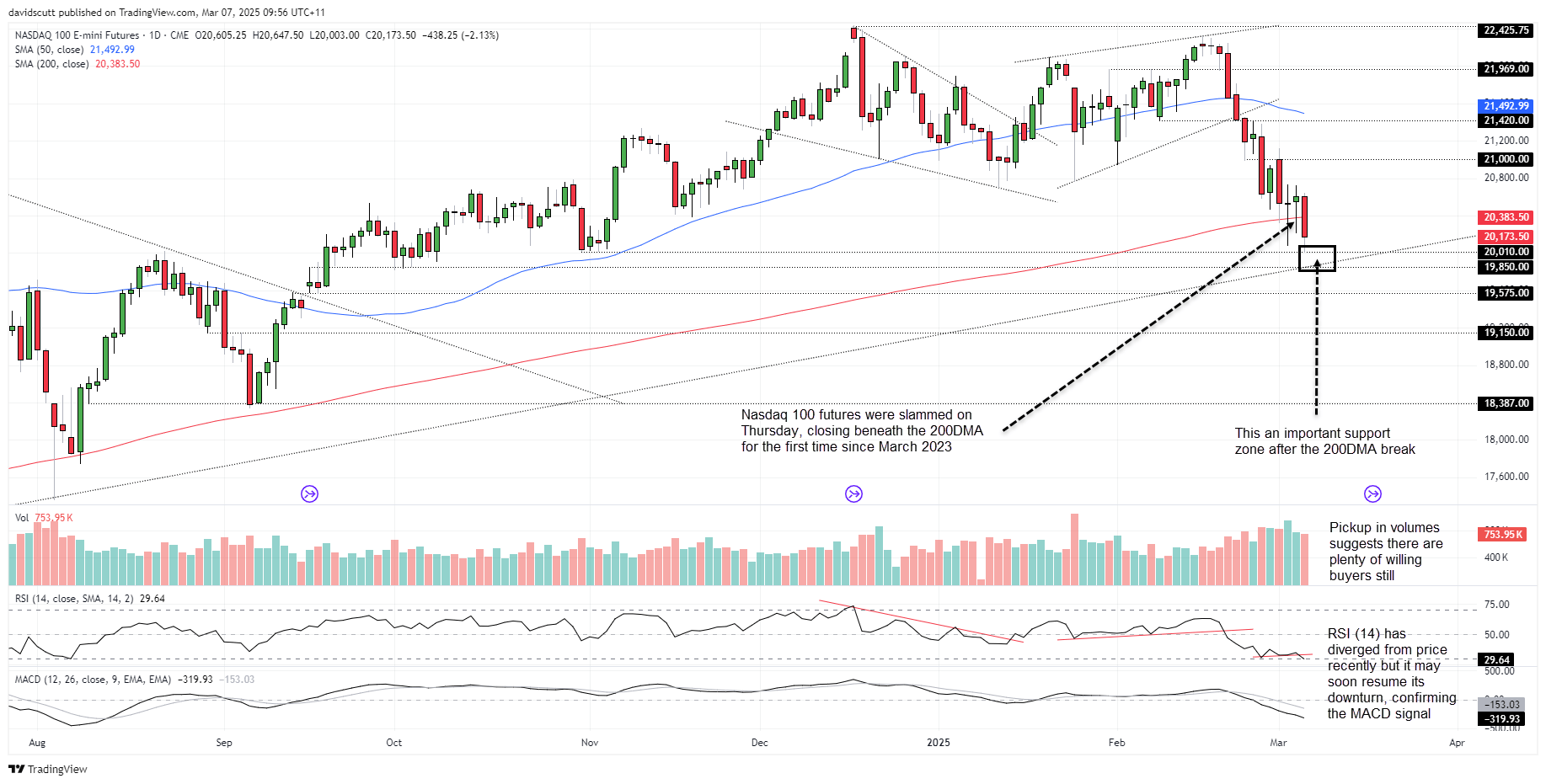 - Nasdaq 100 futures close below 200DMA for the first time since March 2023