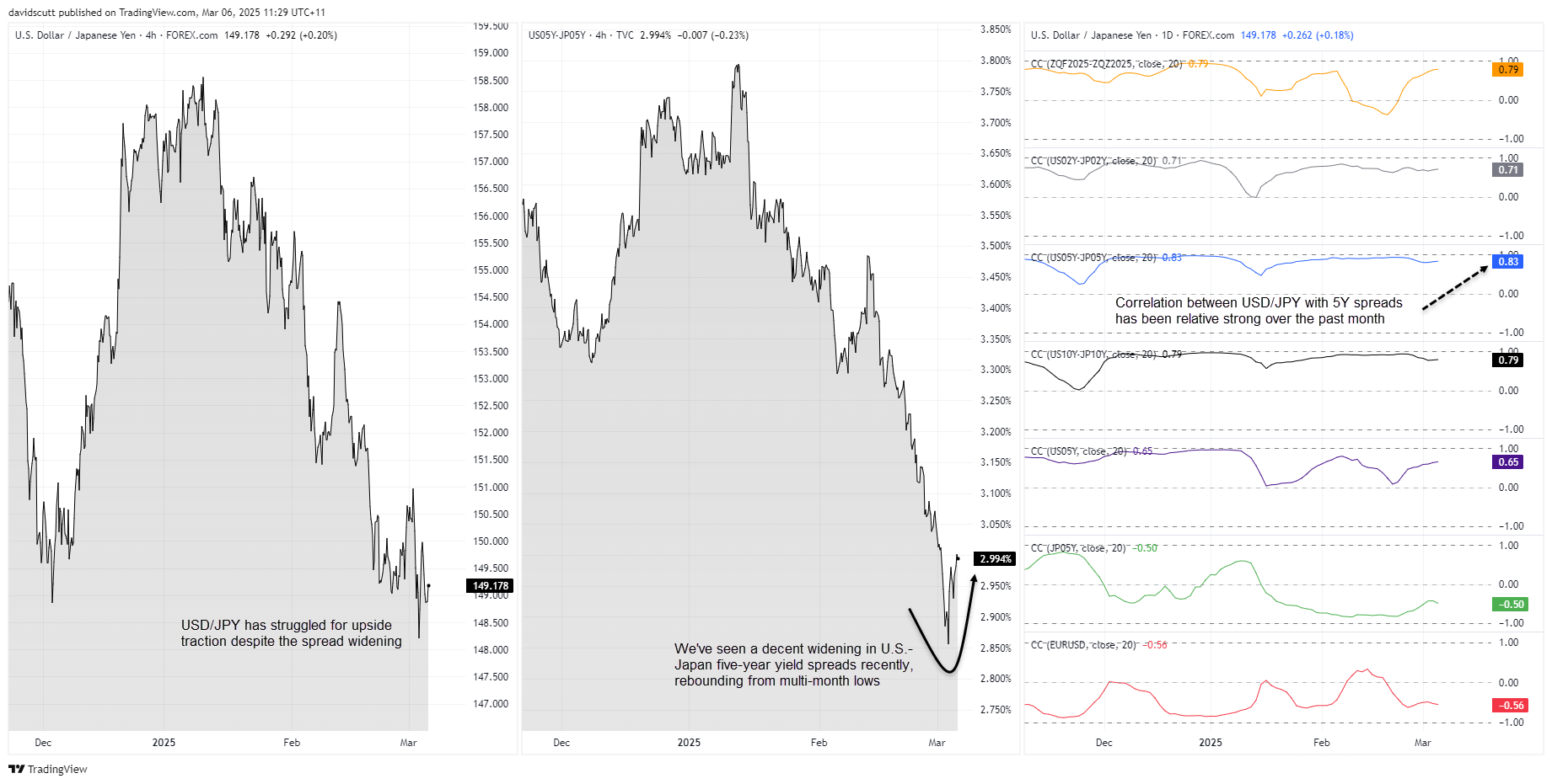 Visually comparing movements in USD/JPY with 5-year yield spreads, you could argue the former should be trading higher than its current level. There’s been a decent widening in yield differentials in recent days, yet USD/JPY has struggled to push meaningfully higher—that’s telling. It may reflect the proximity of Japan’s financial year-end later this month or potentially capital outflows from the U.S. to other regions, such as Europe. The relationship between yields and USD/JPY remains, but it’s not delivering sizeable moves.