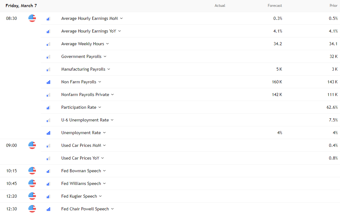 After the payrolls report drops, it will be followed by speeches from Federal Reserve officials, including chairman Jerome Powell. These are on the calendar for reason, meaning if there are any implications when it comes to the rates outlook, it will be communicated via these events.