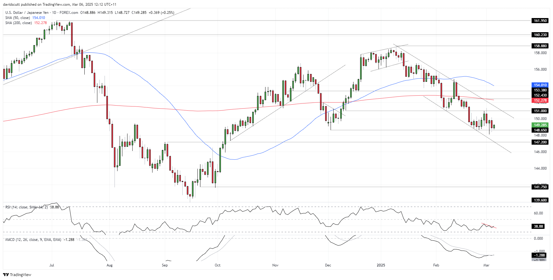 USD/JPY remains in an established downtrend, more recently trading in a sideways range between 151.00 on the topside and 148.65 on the downside. These levels should be the initial focus ahead of the payrolls report.